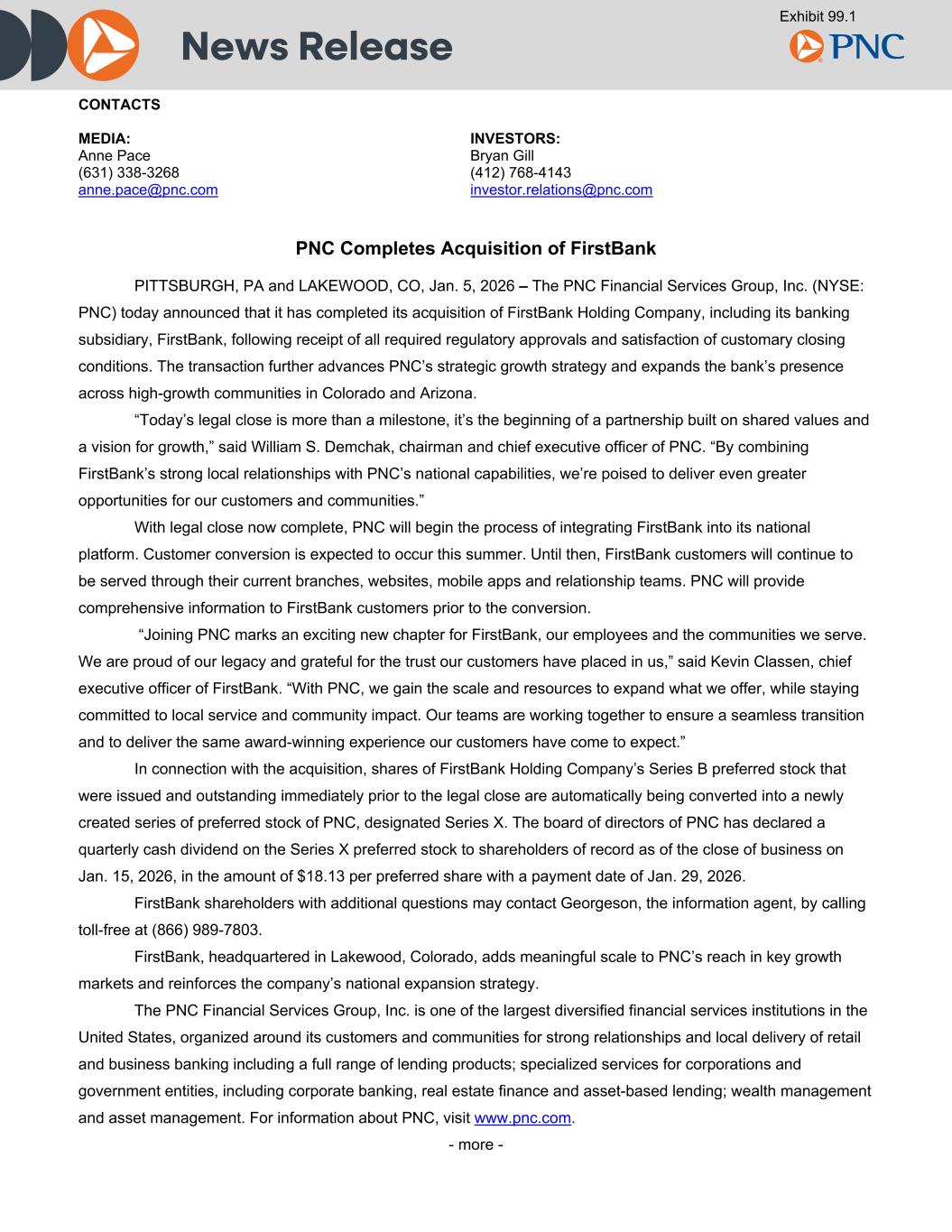 News Release CONTACTS MEDIA: INVESTORS: Anne Pace Bryan Gill (631) 338-3268 (412) 768-4143 anne.pace@pnc.com investor.relations@pnc.com PNC Completes Acquisition of FirstBank PITTSBURGH, PA and LAKEWOOD, CO, Jan. 5, 2026 – The PNC Financial Services Group, Inc. (NYSE: PNC) today announced that it has completed its acquisition of FirstBank Holding Company, including its banking subsidiary, FirstBank, following receipt of all required regulatory approvals and satisfaction of customary closing conditions. The transaction further advances PNC’s strategic growth strategy and expands the bank’s presence across high-growth communities in Colorado and Arizona. “Today’s legal close is more than a milestone, it’s the beginning of a partnership built on shared values and a vision for growth,” said William S. Demchak, chairman and chief executive officer of PNC. “By combining FirstBank’s strong local relationships with PNC’s national capabilities, we’re poised to deliver even greater opportunities for our customers and communities.” With legal close now complete, PNC will begin the process of integrating FirstBank into its national platform. Customer conversion is expected to occur this summer. Until then, FirstBank customers will continue to be served through their current branches, websites, mobile apps and relationship teams. PNC will provide comprehensive information to FirstBank customers prior to the conversion. “Joining PNC marks an exciting new chapter for FirstBank, our employees and the communities we serve. We are proud of our legacy and grateful for the trust our customers have placed in us,” said Kevin Classen, chief executive officer of FirstBank. “With PNC, we gain the scale and resources to expand what we offer, while staying committed to local service and community impact. Our teams are working together to ensure a seamless transition and to deliver the same award-winning experience our customers have come to expect.” In connection with the acquisition, shares of FirstBank Holding Company’s Series B preferred stock that were issued and outstanding immediately prior to the legal close are automatically being converted into a newly created series of preferred stock of PNC, designated Series X. The board of directors of PNC has declared a quarterly cash dividend on the Series X preferred stock to shareholders of record as of the close of business on Jan. 15, 2026, in the amount of $18.13 per preferred share with a payment date of Jan. 29, 2026. FirstBank shareholders with additional questions may contact Georgeson, the information agent, by calling toll-free at (866) 989-7803. FirstBank, headquartered in Lakewood, Colorado, adds meaningful scale to PNC’s reach in key growth markets and reinforces the company’s national expansion strategy. The PNC Financial Services Group, Inc. is one of the largest diversified financial services institutions in the United States, organized around its customers and communities for strong relationships and local delivery of retail and business banking including a full range of lending products; specialized services for corporations and government entities, including corporate banking, real estate finance and asset-based lending; wealth management and asset management. For information about PNC, visit www.pnc.com. - more - Exhibit 99.1
