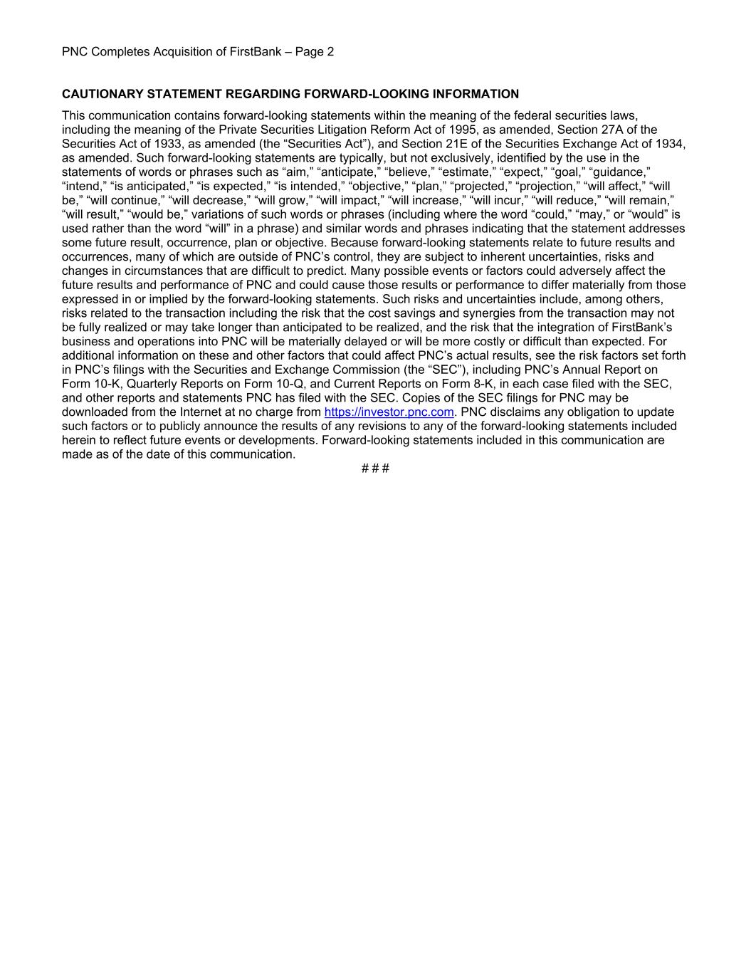PNC Completes Acquisition of FirstBank – Page 2 CAUTIONARY STATEMENT REGARDING FORWARD-LOOKING INFORMATION This communication contains forward-looking statements within the meaning of the federal securities laws, including the meaning of the Private Securities Litigation Reform Act of 1995, as amended, Section 27A of the Securities Act of 1933, as amended (the “Securities Act”), and Section 21E of the Securities Exchange Act of 1934, as amended. Such forward-looking statements are typically, but not exclusively, identified by the use in the statements of words or phrases such as “aim,” “anticipate,” “believe,” “estimate,” “expect,” “goal,” “guidance,” “intend,” “is anticipated,” “is expected,” “is intended,” “objective,” “plan,” “projected,” “projection,” “will affect,” “will be,” “will continue,” “will decrease,” “will grow,” “will impact,” “will increase,” “will incur,” “will reduce,” “will remain,” “will result,” “would be,” variations of such words or phrases (including where the word “could,” “may,” or “would” is used rather than the word “will” in a phrase) and similar words and phrases indicating that the statement addresses some future result, occurrence, plan or objective. Because forward-looking statements relate to future results and occurrences, many of which are outside of PNC’s control, they are subject to inherent uncertainties, risks and changes in circumstances that are difficult to predict. Many possible events or factors could adversely affect the future results and performance of PNC and could cause those results or performance to differ materially from those expressed in or implied by the forward-looking statements. Such risks and uncertainties include, among others, risks related to the transaction including the risk that the cost savings and synergies from the transaction may not be fully realized or may take longer than anticipated to be realized, and the risk that the integration of FirstBank’s business and operations into PNC will be materially delayed or will be more costly or difficult than expected. For additional information on these and other factors that could affect PNC’s actual results, see the risk factors set forth in PNC’s filings with the Securities and Exchange Commission (the “SEC”), including PNC’s Annual Report on Form 10-K, Quarterly Reports on Form 10-Q, and Current Reports on Form 8-K, in each case filed with the SEC, and other reports and statements PNC has filed with the SEC. Copies of the SEC filings for PNC may be downloaded from the Internet at no charge from https://investor.pnc.com. PNC disclaims any obligation to update such factors or to publicly announce the results of any revisions to any of the forward-looking statements included herein to reflect future events or developments. Forward-looking statements included in this communication are made as of the date of this communication. # # #