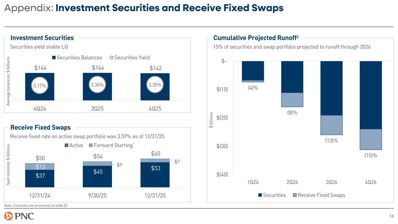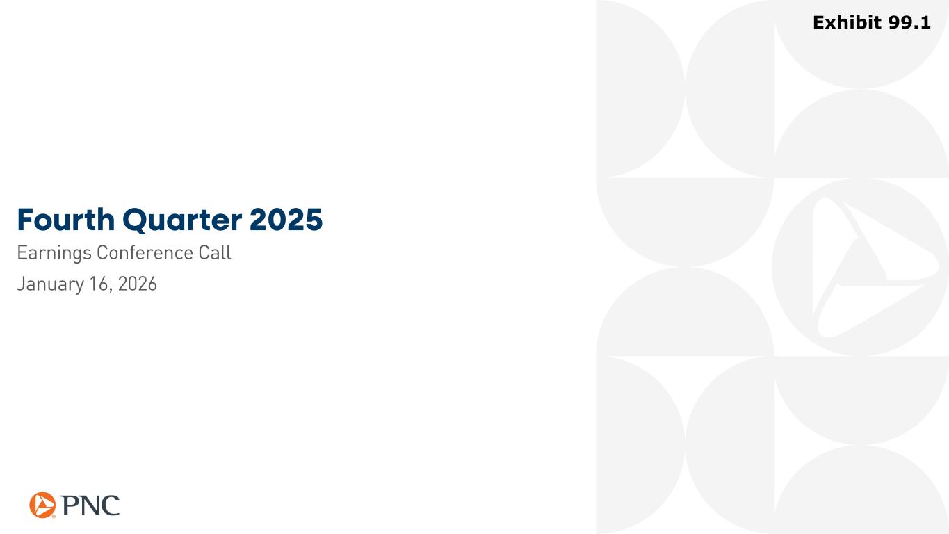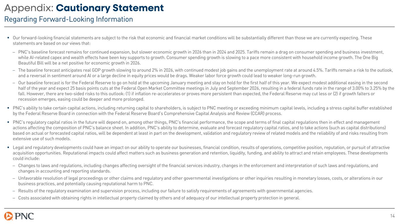 14 Appendix: Cautionary Statement Regarding Forward-Looking Information Our forward-looking financial statements are subject to the risk that economic and financial market conditions will be substantially different than those we are currently expecting. These statements are based on our views that: − PNC’s baseline forecast remains for continued expansion, but slower economic growth in 2026 than in 2024 and 2025. Tariffs remain a drag on consumer spending and business investment, while AI-related capex and wealth effects have been key supports to growth. Consumer spending growth is slowing to a pace more consistent with household income growth. The One Big Beautiful Bill will be a net positive for economic growth in 2026. − The baseline forecast anticipates real GDP growth slowing to around 2% in 2026, with continued modest job gains and the unemployment rate at around 4.5%. Tariffs remain a risk to the outlook, and a reversal in sentiment around AI or a large decline in equity prices would be drags. Weaker labor force growth could lead to weaker long-run growth. − Our baseline forecast is for the Federal Reserve to go on hold at the upcoming January meeting and stay on hold for the first half of this year. We expect modest additional easing in the second half of the year and expect 25 basis points cuts at the Federal Open Market Committee meetings in July and September 2026, resulting in a federal funds rate in the range of 3.00% to 3.25% by the fall. However, there are two-sided risks to this outlook: (1) if inflation re-accelerates or proves more persistent than expected, the Federal Reserve may cut less or (2) if growth falters or recession emerges, easing could be deeper and more prolonged. PNC's ability to take certain capital actions, including returning capital to shareholders, is subject to PNC meeting or exceeding minimum capital levels, including a stress capital buffer established by the Federal Reserve Board in connection with the Federal Reserve Board's Comprehensive Capital Analysis and Review (CCAR) process. PNC's regulatory capital ratios in the future will depend on, among other things, PNC's financial performance, the scope and terms of final capital regulations then in effect and management actions affecting the composition of PNC's balance sheet. In addition, PNC's ability to determine, evaluate and forecast regulatory capital ratios, and to take actions (such as capital distributions) based on actual or forecasted capital ratios, will be dependent at least in part on the development, validation and regulatory review of related models and the reliability of and risks resulting from extensive use of such models. Legal and regulatory developments could have an impact on our ability to operate our businesses, financial condition, results of operations, competitive position, reputation, or pursuit of attractive acquisition opportunities. Reputational impacts could affect matters such as business generation and retention, liquidity, funding, and ability to attract and retain employees. These developments could include: − Changes to laws and regulations, including changes affecting oversight of the financial services industry, changes in the enforcement and interpretation of such laws and regulations, and changes in accounting and reporting standards. − Unfavorable resolution of legal proceedings or other claims and regulatory and other governmental investigations or other inquiries resulting in monetary losses, costs, or alterations in our business practices, and potentially causing reputational harm to PNC. − Results of the regulatory examination and supervision process, including our failure to satisfy requirements of agreements with governmental agencies. − Costs associated with obtaining rights in intellectual property claimed by others and of adequacy of our intellectual property protection in general.