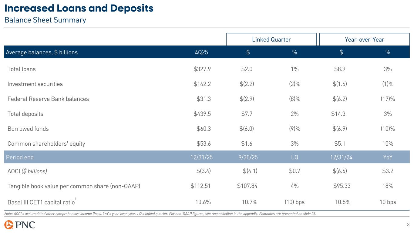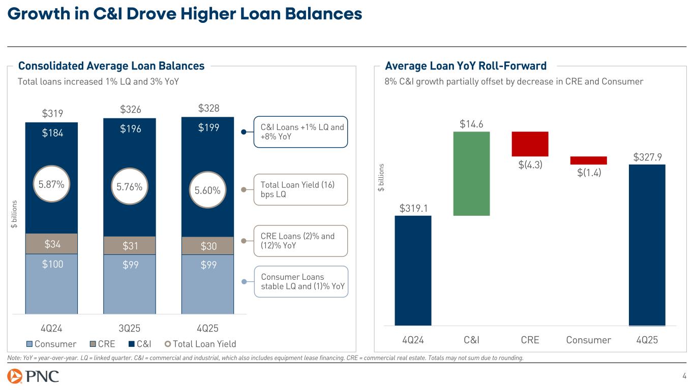3 Increased Loans and Deposits Balance Sheet Summary Linked Quarter Year-over-Year Average balances, $ billions 4Q25 $ % $ % Total loans $327.9 $2.0 1% $8.9 3% Investment securities $142.2 $(2.2) (2)% $(1.6) (1)% Federal Reserve Bank balances $31.3 $(2.9) (8)% $(6.2) (17)% Total deposits $439.5 $7.7 2% $14.3 3% Borrowed funds $60.3 $(6.0) (9)% $(6.9) (10)% Common shareholders’ equity $53.6 $1.6 3% $5.1 10% Period end 12/31/25 9/30/25 LQ 12/31/24 YoY AOCI ($ billions) $(3.4) $(4.1) $0.7 $(6.6) $3.2 Tangible book value per common share (non-GAAP) $112.51 $107.84 4% $95.33 18% Basel III CET1 capital ratio 1 10.6% 10.7% (10) bps 10.5% 10 bps Note: AOCI = accumulated other comprehensive income (loss). YoY = year-over-year. LQ = linked quarter. For non-GAAP figures, see reconciliation in the appendix. Footnotes are presented on slide 25.