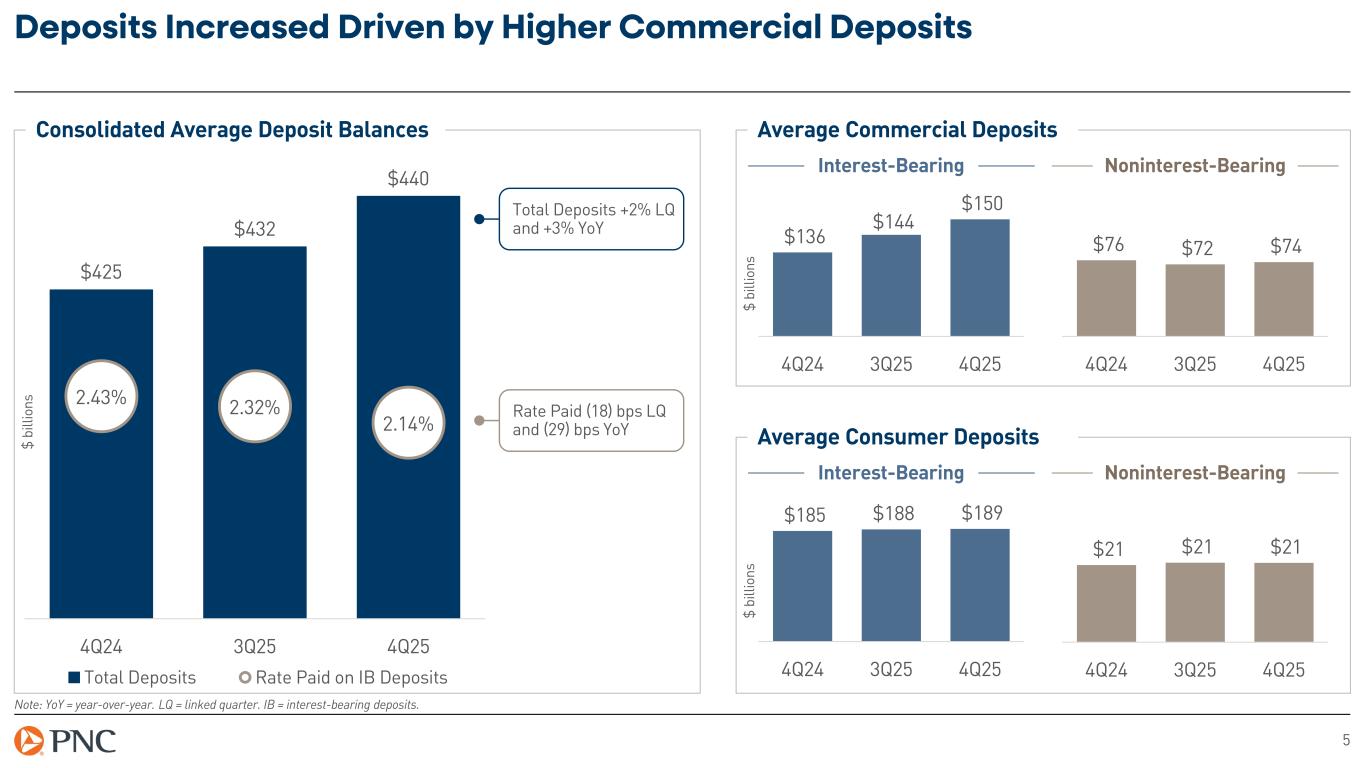 4 Growth in C&I Drove Higher Loan Balances Note: YoY = year-over-year. LQ = linked quarter. C&I = commercial and industrial, which also includes equipment lease financing. CRE = commercial real estate. Totals may not sum due to rounding. Consolidated Average Loan Balances Total loans increased 1% LQ and 3% YoY $100 $99 $99 $34 $31 $30 $184 $196 $199 $319 $326 $328 5.87% 5.76% 5.60% 4Q24 3Q25 4Q25 Consumer CRE C&I Total Loan Yield $ bi lli on s Consumer Loans stable LQ and (1)% YoY Total Loan Yield (16) bps LQ C&I Loans +1% LQ and +8% YoY Average Loan YoY Roll-Forward 8% C&I growth partially offset by decrease in CRE and Consumer $ bi lli on s 4Q24 C&I CRE Consumer 4Q25 $319.1 $14.6 $(4.3) $327.9 $(1.4) CRE Loans (2)% and (12)% YoY