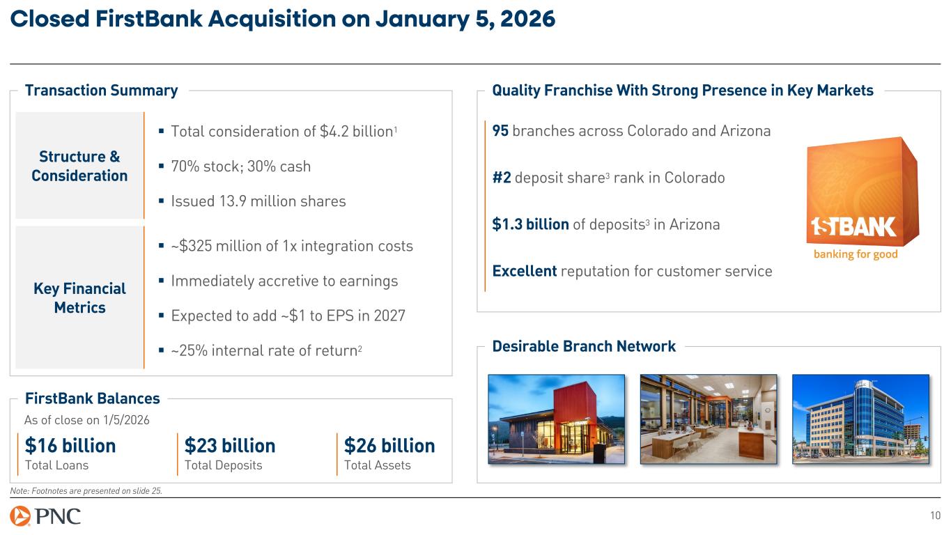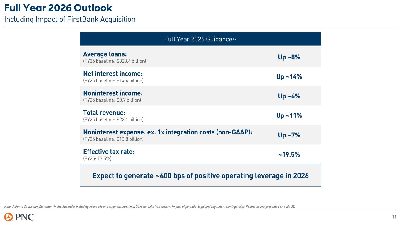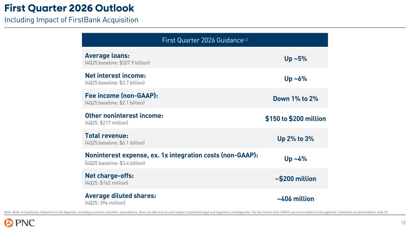 12 First Quarter 2026 Outlook Including Impact of FirstBank Acquisition Note: Refer to Cautionary Statement in the Appendix, including economic and other assumptions. Does not take into account impact of potential legal and regulatory contingencies. For fee income (non-GAAP), see reconciliation in the appendix. Footnotes are presented on slide 25. First Quarter 2026 Guidance1,2 Average loans: (4Q25 baseline: $327.9 billion) Up ~5% Net interest income: (4Q25 baseline: $3.7 billion) Up ~6% Fee income (non-GAAP): (4Q25 baseline: $2.1 billion) Down 1% to 2% Other noninterest income: (4Q25: $217 million) $150 to $200 million Total revenue: (4Q25 baseline: $6.1 billion) Up 2% to 3% Noninterest expense, ex. 1x integration costs (non-GAAP): (4Q25 baseline: $3.6 billion) Up ~4% Net charge-offs: (4Q25: $162 million) ~$200 million Average diluted shares: (4Q25: 394 million) ~406 million