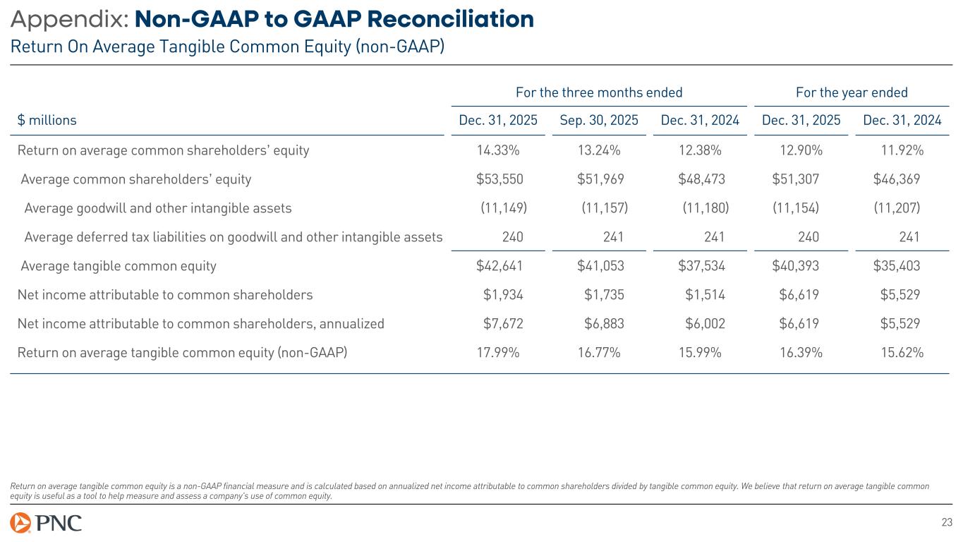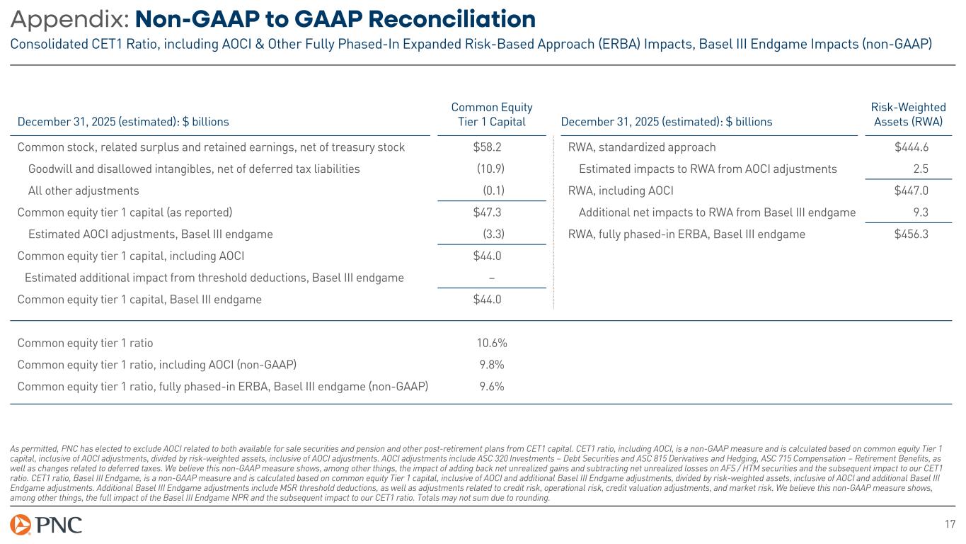 17 Appendix: Non-GAAP to GAAP Reconciliation Consolidated CET1 Ratio, including AOCI & Other Fully Phased-In Expanded Risk-Based Approach (ERBA) Impacts, Basel III Endgame Impacts (non-GAAP) As permitted, PNC has elected to exclude AOCI related to both available for sale securities and pension and other post-retirement plans from CET1 capital. CET1 ratio, including AOCI, is a non-GAAP measure and is calculated based on common equity Tier 1 capital, inclusive of AOCI adjustments, divided by risk-weighted assets, inclusive of AOCI adjustments. AOCI adjustments include ASC 320 Investments – Debt Securities and ASC 815 Derivatives and Hedging, ASC 715 Compensation – Retirement Benefits, as well as changes related to deferred taxes. We believe this non-GAAP measure shows, among other things, the impact of adding back net unrealized gains and subtracting net unrealized losses on AFS / HTM securities and the subsequent impact to our CET1 ratio. CET1 ratio, Basel III Endgame, is a non-GAAP measure and is calculated based on common equity Tier 1 capital, inclusive of AOCI and additional Basel III Endgame adjustments, divided by risk-weighted assets, inclusive of AOCI and additional Basel III Endgame adjustments. Additional Basel III Endgame adjustments include MSR threshold deductions, as well as adjustments related to credit risk, operational risk, credit valuation adjustments, and market risk. We believe this non-GAAP measure shows, among other things, the full impact of the Basel III Endgame NPR and the subsequent impact to our CET1 ratio. Totals may not sum due to rounding. December 31, 2025 (estimated): $ billions Common Equity Tier 1 Capital December 31, 2025 (estimated): $ billions Risk-Weighted Assets (RWA) Common stock, related surplus and retained earnings, net of treasury stock $58.2 RWA, standardized approach $444.6 Goodwill and disallowed intangibles, net of deferred tax liabilities (10.9) Estimated impacts to RWA from AOCI adjustments 2.5 All other adjustments (0.1) RWA, including AOCI $447.0 Common equity tier 1 capital (as reported) $47.3 Additional net impacts to RWA from Basel III endgame 9.3 Estimated AOCI adjustments, Basel III endgame (3.3) RWA, fully phased-in ERBA, Basel III endgame $456.3 Common equity tier 1 capital, including AOCI $44.0 Estimated additional impact from threshold deductions, Basel III endgame – Common equity tier 1 capital, Basel III endgame $44.0 Common equity tier 1 ratio 10.6% Common equity tier 1 ratio, including AOCI (non-GAAP) 9.8% Common equity tier 1 ratio, fully phased-in ERBA, Basel III endgame (non-GAAP) 9.6%