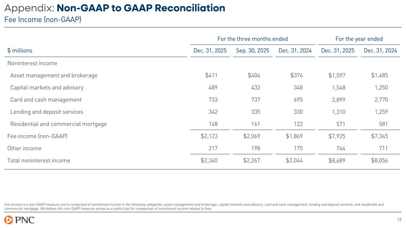 19 Appendix: Non-GAAP to GAAP Reconciliation Fee Income (non-GAAP) For the three months ended For the year ended $ millions Dec. 31, 2025 Sep. 30, 2025 Dec. 31, 2024 Dec. 31, 2025 Dec. 31, 2024 Noninterest income Asset management and brokerage $411 $404 $374 $1,597 $1,485 Capital markets and advisory 489 432 348 1,548 1,250 Card and cash management 733 737 695 2,899 2,770 Lending and deposit services 342 335 330 1,310 1,259 Residential and commercial mortgage 148 161 122 571 581 Fee income (non-GAAP) $2,123 $2,069 $1,869 $7,925 $7,345 Other income 217 198 175 764 711 Total noninterest income $2,340 $2,267 $2,044 $8,689 $8,056 Fee income is a non-GAAP measure and is comprised of noninterest income in the following categories: asset management and brokerage, capital markets and advisory, card and cash management, lending and deposit services, and residential and commercial mortgage. We believe this non-GAAP measure serves as a useful tool for comparison of noninterest income related to fees.