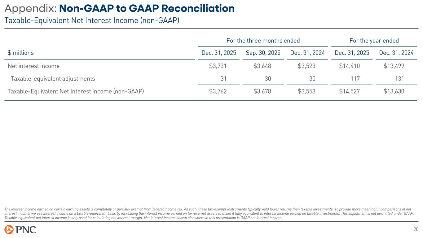 20 Appendix: Non-GAAP to GAAP Reconciliation Taxable-Equivalent Net Interest Income (non-GAAP) The interest income earned on certain earning assets is completely or partially exempt from federal income tax. As such, these tax-exempt instruments typically yield lower returns than taxable investments. To provide more meaningful comparisons of net interest income, we use interest income on a taxable-equivalent basis by increasing the interest income earned on tax-exempt assets to make it fully equivalent to interest income earned on taxable investments. This adjustment is not permitted under GAAP. Taxable-equivalent net interest income is only used for calculating net interest margin. Net interest income shown elsewhere in this presentation is GAAP net interest income. For the three months ended For the year ended $ millions Dec. 31, 2025 Sep. 30, 2025 Dec. 31, 2024 Dec. 31, 2025 Dec. 31, 2024 Net interest income $3,731 $3,648 $3,523 $14,410 $13,499 Taxable-equivalent adjustments 31 30 30 117 131 Taxable-Equivalent Net Interest Income (non-GAAP) $3,762 $3,678 $3,553 $14,527 $13,630