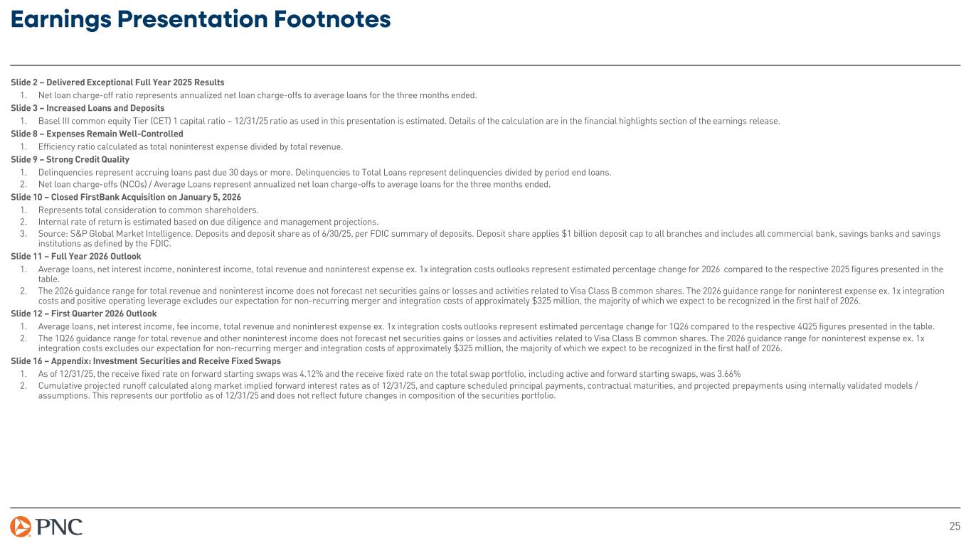 25 Earnings Presentation Footnotes Slide 2 – Delivered Exceptional Full Year 2025 Results 1. Net loan charge-off ratio represents annualized net loan charge-offs to average loans for the three months ended. Slide 3 – Increased Loans and Deposits 1. Basel III common equity Tier (CET) 1 capital ratio – 12/31/25 ratio as used in this presentation is estimated. Details of the calculation are in the financial highlights section of the earnings release. Slide 8 – Expenses Remain Well-Controlled 1. Efficiency ratio calculated as total noninterest expense divided by total revenue. Slide 9 – Strong Credit Quality 1. Delinquencies represent accruing loans past due 30 days or more. Delinquencies to Total Loans represent delinquencies divided by period end loans. 2. Net loan charge-offs (NCOs) / Average Loans represent annualized net loan charge-offs to average loans for the three months ended. Slide 10 – Closed FirstBank Acquisition on January 5, 2026 1. Represents total consideration to common shareholders. 2. Internal rate of return is estimated based on due diligence and management projections. 3. Source: S&P Global Market Intelligence. Deposits and deposit share as of 6/30/25, per FDIC summary of deposits. Deposit share applies $1 billion deposit cap to all branches and includes all commercial bank, savings banks and savings institutions as defined by the FDIC. Slide 11 – Full Year 2026 Outlook 1. Average loans, net interest income, noninterest income, total revenue and noninterest expense ex. 1x integration costs outlooks represent estimated percentage change for 2026 compared to the respective 2025 figures presented in the table. 2. The 2026 guidance range for total revenue and noninterest income does not forecast net securities gains or losses and activities related to Visa Class B common shares. The 2026 guidance range for noninterest expense ex. 1x integration costs and positive operating leverage excludes our expectation for non-recurring merger and integration costs of approximately $325 million, the majority of which we expect to be recognized in the first half of 2026. Slide 12 – First Quarter 2026 Outlook 1. Average loans, net interest income, fee income, total revenue and noninterest expense ex. 1x integration costs outlooks represent estimated percentage change for 1Q26 compared to the respective 4Q25 figures presented in the table. 2. The 1Q26 guidance range for total revenue and other noninterest income does not forecast net securities gains or losses and activities related to Visa Class B common shares. The 2026 guidance range for noninterest expense ex. 1x integration costs excludes our expectation for non-recurring merger and integration costs of approximately $325 million, the majority of which we expect to be recognized in the first half of 2026. Slide 16 – Appendix: Investment Securities and Receive Fixed Swaps 1. As of 12/31/25, the receive fixed rate on forward starting swaps was 4.12% and the receive fixed rate on the total swap portfolio, including active and forward starting swaps, was 3.66% 2. Cumulative projected runoff calculated along market implied forward interest rates as of 12/31/25, and capture scheduled principal payments, contractual maturities, and projected prepayments using internally validated models / assumptions. This represents our portfolio as of 12/31/25 and does not reflect future changes in composition of the securities portfolio.