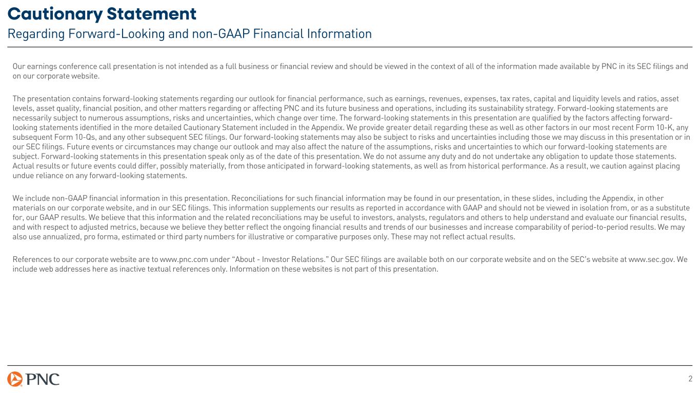 2 Cautionary Statement Regarding Forward-Looking and non-GAAP Financial Information Our earnings conference call presentation is not intended as a full business or financial review and should be viewed in the context of all of the information made available by PNC in its SEC filings and on our corporate website. The presentation contains forward-looking statements regarding our outlook for financial performance, such as earnings, revenues, expenses, tax rates, capital and liquidity levels and ratios, asset levels, asset quality, financial position, and other matters regarding or affecting PNC and its future business and operations, including its sustainability strategy. Forward-looking statements are necessarily subject to numerous assumptions, risks and uncertainties, which change over time. The forward-looking statements in this presentation are qualified by the factors affecting forward- looking statements identified in the more detailed Cautionary Statement included in the Appendix. We provide greater detail regarding these as well as other factors in our most recent Form 10-K, any subsequent Form 10-Qs, and any other subsequent SEC filings. Our forward-looking statements may also be subject to risks and uncertainties including those we may discuss in this presentation or in our SEC filings. Future events or circumstances may change our outlook and may also affect the nature of the assumptions, risks and uncertainties to which our forward-looking statements are subject. Forward-looking statements in this presentation speak only as of the date of this presentation. We do not assume any duty and do not undertake any obligation to update those statements. Actual results or future events could differ, possibly materially, from those anticipated in forward-looking statements, as well as from historical performance. As a result, we caution against placing undue reliance on any forward-looking statements. We include non-GAAP financial information in this presentation. Reconciliations for such financial information may be found in our presentation, in these slides, including the Appendix, in other materials on our corporate website, and in our SEC filings. This information supplements our results as reported in accordance with GAAP and should not be viewed in isolation from, or as a substitute for, our GAAP results. We believe that this information and the related reconciliations may be useful to investors, analysts, regulators and others to help understand and evaluate our financial results, and with respect to adjusted metrics, because we believe they better reflect the ongoing financial results and trends of our businesses and increase comparability of period-to-period results. We may also use annualized, pro forma, estimated or third party numbers for illustrative or comparative purposes only. These may not reflect actual results. References to our corporate website are to www.pnc.com under “About - Investor Relations.” Our SEC filings are available both on our corporate website and on the SEC’s website at www.sec.gov. We include web addresses here as inactive textual references only. Information on these websites is not part of this presentation.