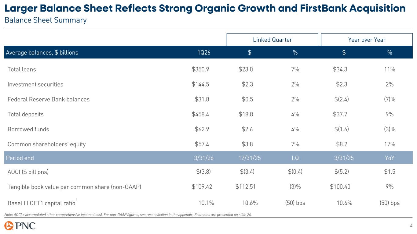 3 Delivered Solid First Quarter 2026 Results Successfully closed FirstBank acquisition on 1/5/2026 Strong legacy loan growth driven by new production and higher utilization Increased net interest income and net interest margin Expenses continue to be well-controlled Credit quality remains strong Maintained strong capital position; Returned $1.4 billion to shareholders including $0.7 billion of share repurchases Note: Comparison made to linked quarter unless otherwise noted. For non-GAAP figures, see reconciliation in the appendix. +7% Average Loans +2% Total Revenue $1.8 billion Net Income $4.32 Adjusted Diluted EPS (non-GAAP) 1Q26 Financial Highlights $4.13 Diluted Earnings per Share (EPS)