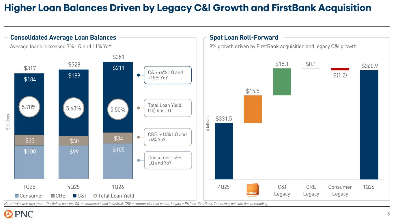 4 Larger Balance Sheet Reflects Strong Organic Growth and FirstBank Acquisition Balance Sheet Summary Linked Quarter Year over Year Average balances, $ billions 1Q26 $ % $ % Total loans $350.9 $23.0 7% $34.3 11% Investment securities $144.5 $2.3 2% $2.3 2% Federal Reserve Bank balances $31.8 $0.5 2% $(2.4) (7)% Total deposits $458.4 $18.8 4% $37.7 9% Borrowed funds $62.9 $2.6 4% $(1.6) (3)% Common shareholders’ equity $57.4 $3.8 7% $8.2 17% Note: AOCI = accumulated other comprehensive income (loss). For non-GAAP figures, see reconciliation in the appendix. Footnotes are presented on slide 26. Period end 3/31/26 12/31/25 LQ 3/31/25 YoY AOCI ($ billions) $(3.8) $(3.4) $(0.4) $(5.2) $1.5 Tangible book value per common share (non-GAAP) $109.42 $112.51 (3)% $100.40 9% Basel III CET1 capital ratio 1 10.1% 10.6% (50) bps 10.6% (50) bps