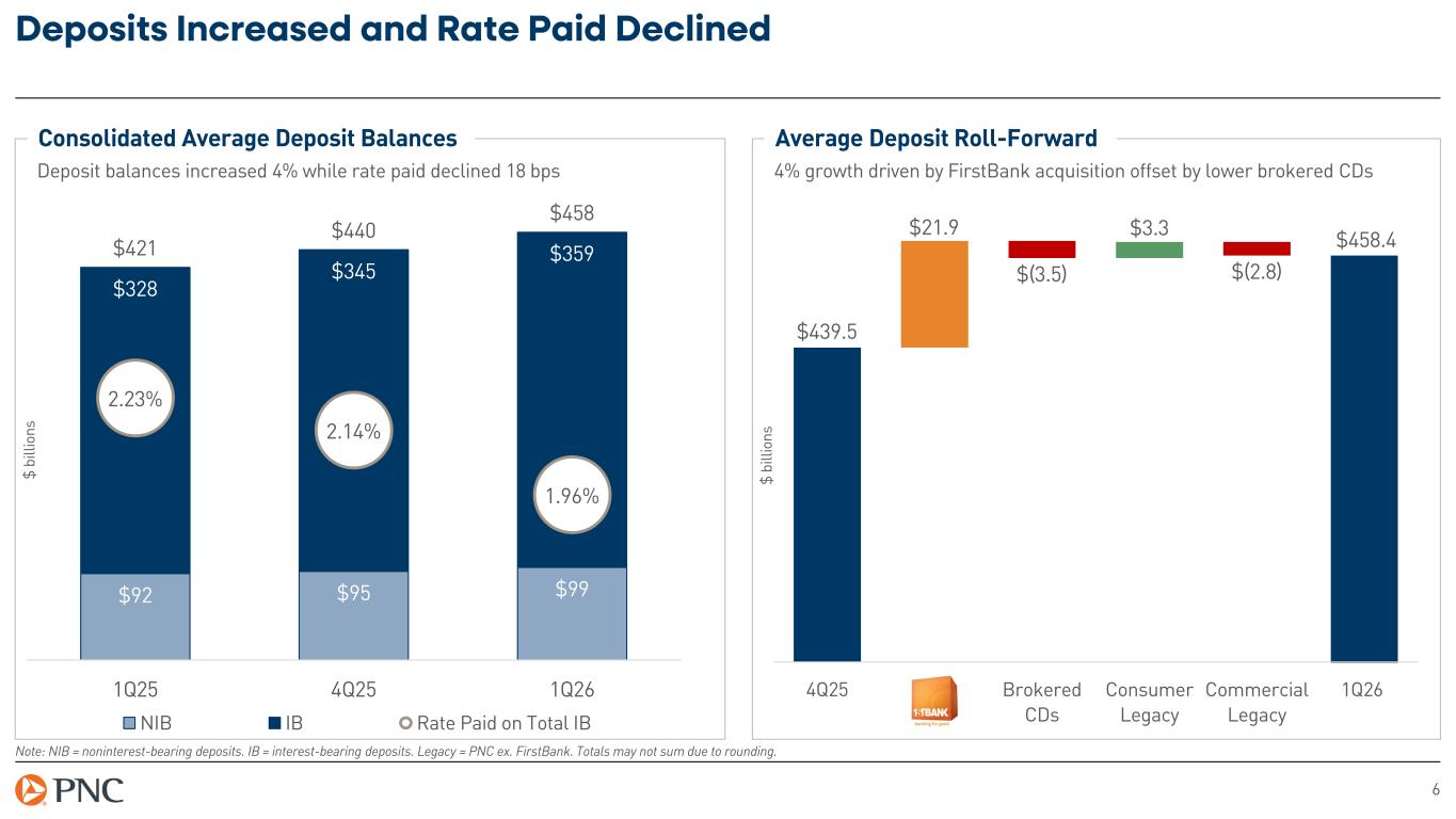 5 Higher Loan Balances Driven by Legacy C&I Growth and FirstBank Acquisition Note: YoY = year over year. LQ = linked quarter. C&I = commercial and industrial. CRE = commercial real estate. Legacy = PNC ex. FirstBank. Totals may not sum due to rounding. Consolidated Average Loan Balances Average loans increased 7% LQ and 11% YoY $ bi lli on s Consumer: +6% LQ and YoY Total Loan Yield: (10) bps LQ C&I: +6% LQ and +15% YoY Spot Loan Roll-Forward 9% growth driven by FirstBank acquisition and legacy C&I growth $ bi lli on s 4Q25 C&I Legacy CRE Legacy Consumer Legacy 1Q26 $331.5 $15.1 $(1.2) $360.9 CRE: +14% LQ and +4% YoY $15.5 $0.1 $100 $99 $105 $33 $30 $34 $184 $199 $211 $317 $328 $351 5.70% 5.60% 5.50% 1Q25 4Q25 1Q26 Consumer CRE C&I Total Loan Yield