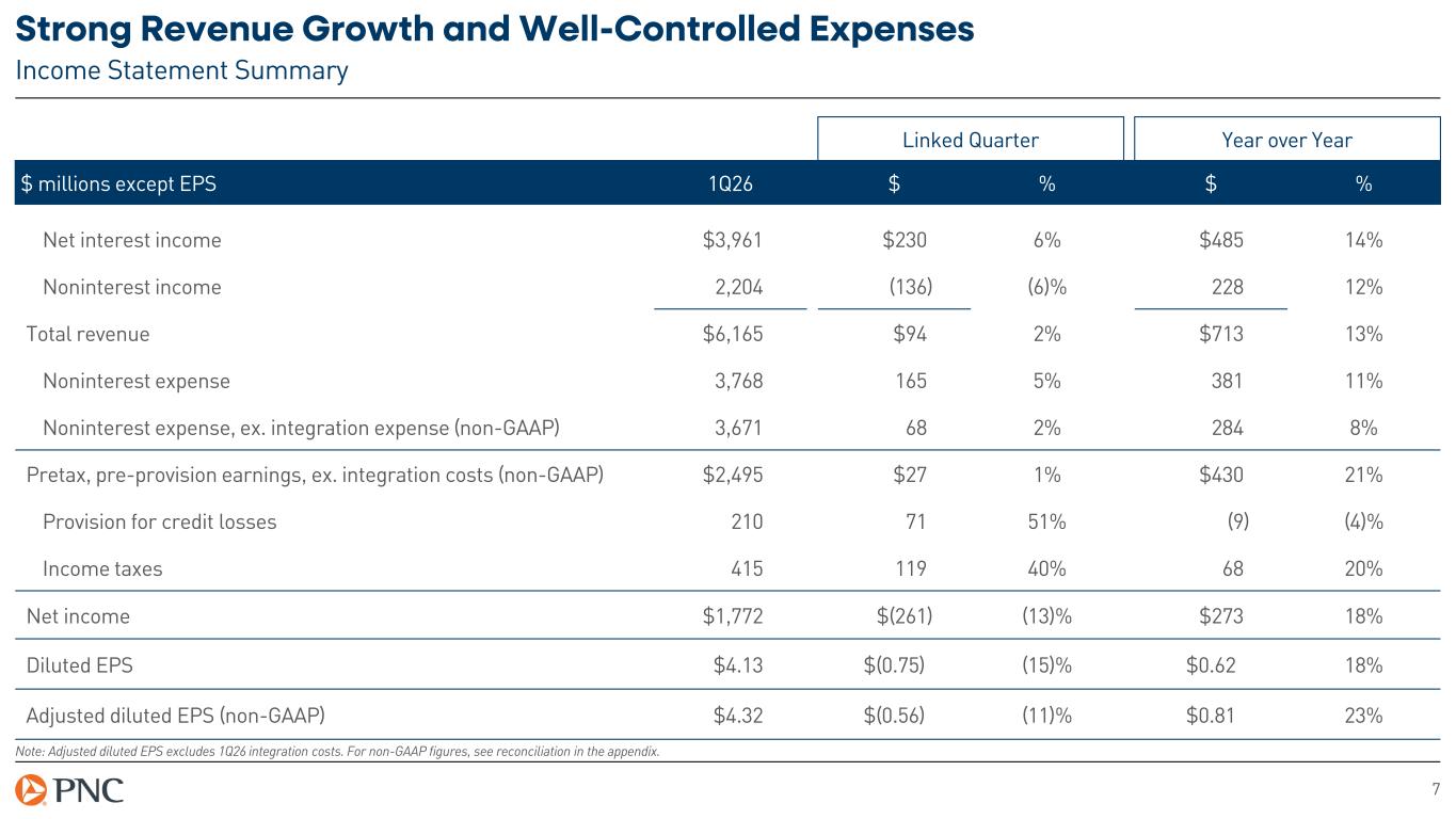 6 Deposits Increased and Rate Paid Declined Note: NIB = noninterest-bearing deposits. IB = interest-bearing deposits. Legacy = PNC ex. FirstBank. Totals may not sum due to rounding. Consolidated Average Deposit Balances $ bi lli on s Deposit balances increased 4% while rate paid declined 18 bps $92 $95 $99 $328 $345 $359$421 $440 $458 2.23% 2.14% 1.96% 1Q25 4Q25 1Q26 NIB IB Rate Paid on Total IB Average Deposit Roll-Forward 4% growth driven by FirstBank acquisition offset by lower brokered CDs $ bi lli on s 4Q25 Brokered CDs Consumer Legacy Commercial Legacy 1Q26 $439.5 $(3.5) $(2.8) $458.4$21.9 $3.3
