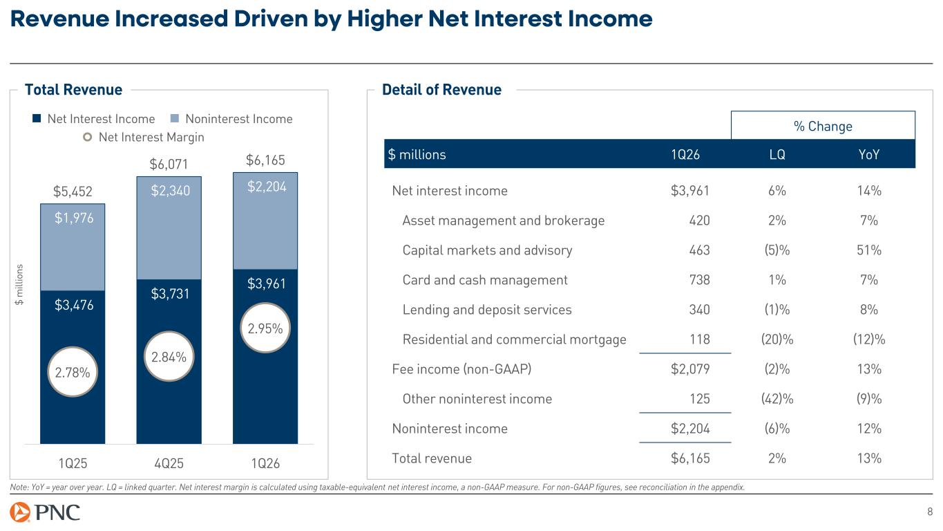7 Strong Revenue Growth and Well-Controlled Expenses Income Statement Summary Linked Quarter Year over Year $ millions except EPS 1Q26 $ % $ % Net interest income $3,961 $230 6% $485 14% Noninterest income 2,204 (136) (6)% 228 12% Total revenue $6,165 $94 2% $713 13% Noninterest expense 3,768 165 5% 381 11% Noninterest expense, ex. integration expense (non-GAAP) 3,671 68 2% 284 8% Pretax, pre-provision earnings, ex. integration costs (non-GAAP) $2,495 $27 1% $430 21% Provision for credit losses 210 71 51% (9) (4)% Income taxes 415 119 40% 68 20% Net income $1,772 $(261) (13)% $273 18% Diluted EPS $4.13 $(0.75) (15)% $0.62 18% Adjusted diluted EPS (non-GAAP) $4.32 $(0.56) (11)% $0.81 23% Note: Adjusted diluted EPS excludes 1Q26 integration costs. For non-GAAP figures, see reconciliation in the appendix.