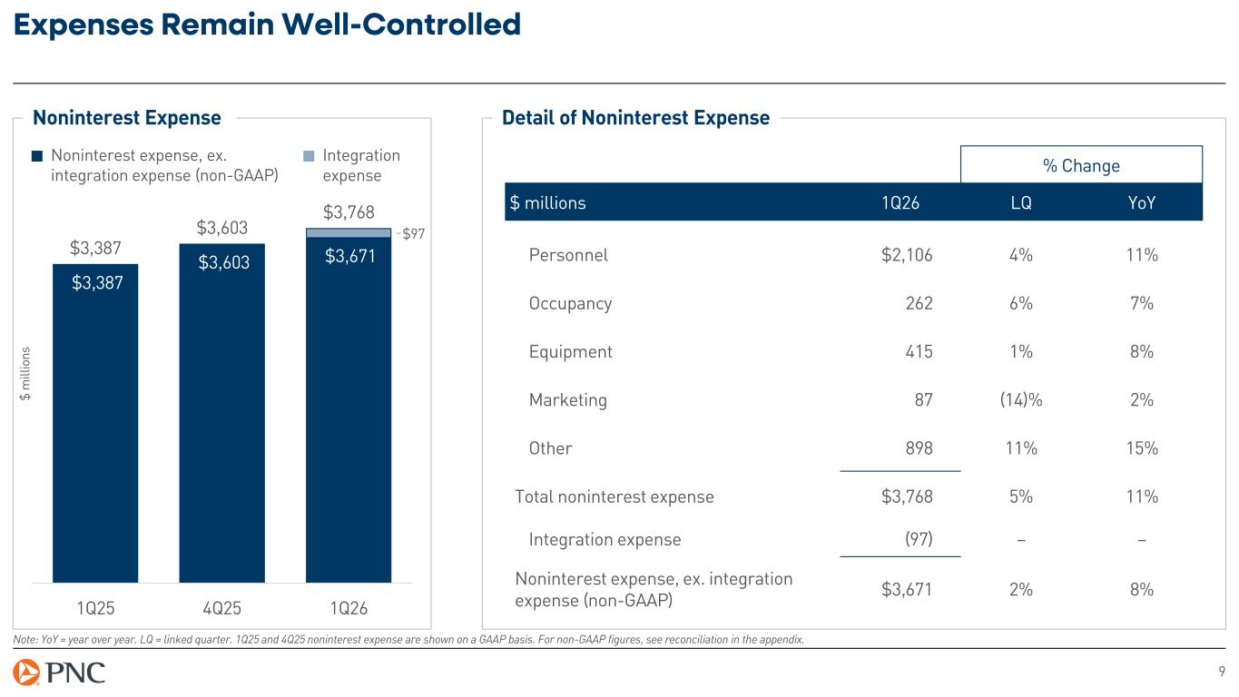 8 Revenue Increased Driven by Higher Net Interest Income Note: YoY = year over year. LQ = linked quarter. Net interest margin is calculated using taxable-equivalent net interest income, a non-GAAP measure. For non-GAAP figures, see reconciliation in the appendix. Total Revenue $3,476 $3,731 $3,961 $1,976 $2,340 $2,204 $5,452 $6,071 $6,165 2.78% 2.84% 2.95% 1Q25 4Q25 1Q26 % Change $ millions 1Q26 LQ YoY Net interest income $3,961 6% 14% Asset management and brokerage 420 2% 7% Capital markets and advisory 463 (5)% 51% Card and cash management 738 1% 7% Lending and deposit services 340 (1)% 8% Residential and commercial mortgage 118 (20)% (12)% Fee income (non-GAAP) $2,079 (2)% 13% Other noninterest income 125 (42)% (9)% Noninterest income $2,204 (6)% 12% Total revenue $6,165 2% 13% Detail of Revenue $ m ill io ns Net Interest Income Noninterest Income Net Interest Margin