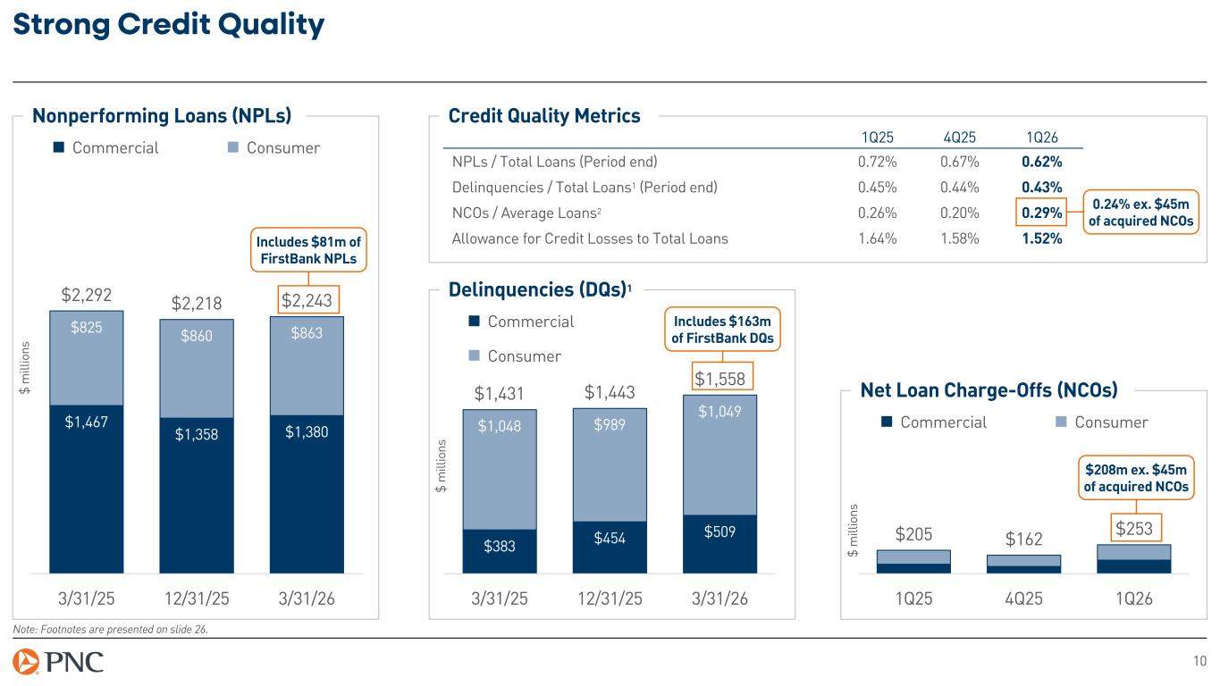9 Expenses Remain Well-Controlled Note: YoY = year over year. LQ = linked quarter. 1Q25 and 4Q25 noninterest expense are shown on a GAAP basis. For non-GAAP figures, see reconciliation in the appendix. Noninterest Expense % Change $ millions 1Q26 LQ YoY Personnel $2,106 4% 11% Occupancy 262 6% 7% Equipment 415 1% 8% Marketing 87 (14)% 2% Other 898 11% 15% Total noninterest expense $3,768 5% 11% Integration expense (97) – – Noninterest expense, ex. integration expense (non-GAAP) $3,671 2% 8% Detail of Noninterest Expense $ m ill io ns Noninterest expense, ex. integration expense (non-GAAP) Integration expense $3,387 $3,603 $3,671 $3,387 $3,603 $3,768 1Q25 4Q25 1Q26 $97