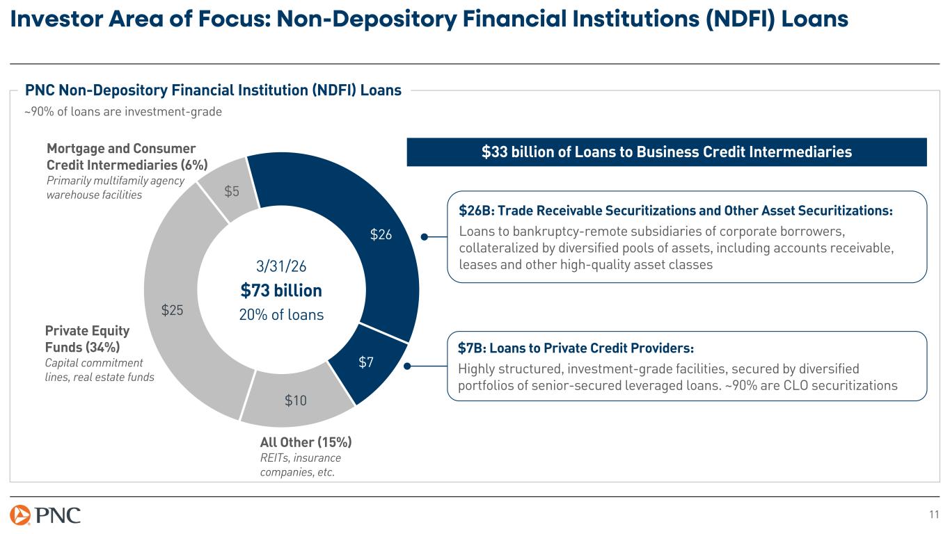 11 Investor Area of Focus: Non-Depository Financial Institutions (NDFI) Loans $26 $7 $10 $25 $5 Private Equity Funds (34%) Capital commitment lines, real estate funds Mortgage and Consumer Credit Intermediaries (6%) Primarily multifamily agency warehouse facilities All Other (15%) REITs, insurance companies, etc. 3/31/26 $73 billion 20% of loans $26B: Trade Receivable Securitizations and Other Asset Securitizations: Loans to bankruptcy-remote subsidiaries of corporate borrowers, collateralized by diversified pools of assets, including accounts receivable, leases and other high-quality asset classes $7B: Loans to Private Credit Providers: Highly structured, investment-grade facilities, secured by diversified portfolios of senior-secured leveraged loans. ~90% are CLO securitizations $33 billion of Loans to Business Credit Intermediaries PNC Non-Depository Financial Institution (NDFI) Loans ~90% of loans are investment-grade