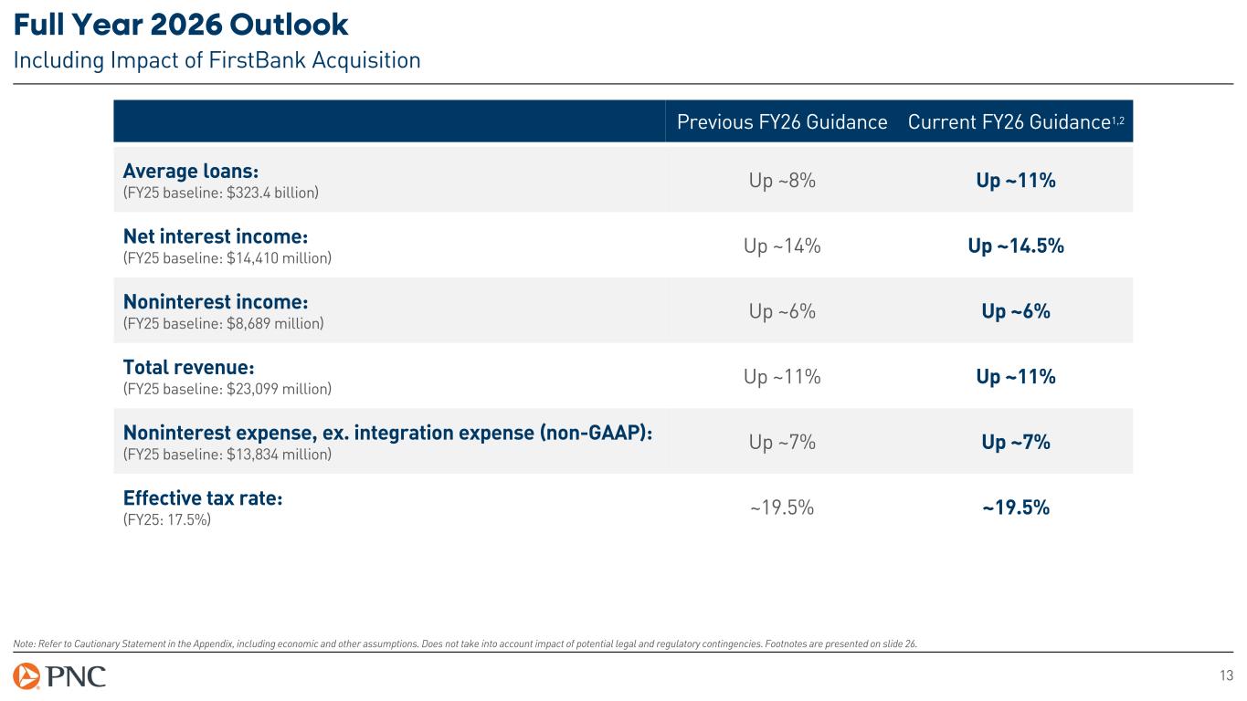 12 Second Quarter 2026 Outlook Note: Refer to Cautionary Statement in the Appendix, including economic and other assumptions. Does not take into account impact of potential legal and regulatory contingencies. For non-GAAP figures, see reconciliation in the appendix. Footnotes are presented on slide 26. Second Quarter 2026 Guidance1,2 Average loans: (1Q26 baseline: $350.9 billion) Up 2% to 3% Net interest income: (1Q26 baseline: $3,961 million) Up ~3% Fee income (non-GAAP): (1Q26 baseline: $2,079 million) Up ~2.5% Other noninterest income: (1Q26: $125 million) $150 to $200 million Total revenue: (1Q26 baseline: $6,165 million) Up ~3.5% Noninterest expense, ex. integration expense (non-GAAP): (1Q26 baseline: $3,671 million) Up ~2% Net charge-offs: (1Q26: $253 million) ~$225 million