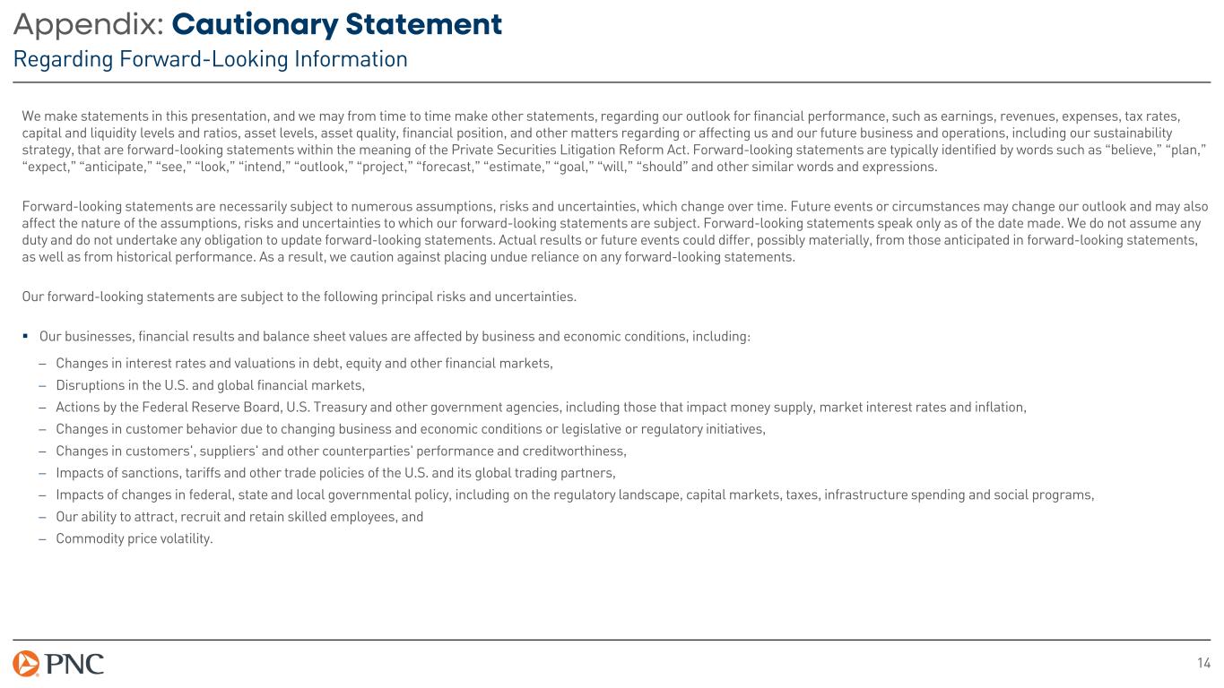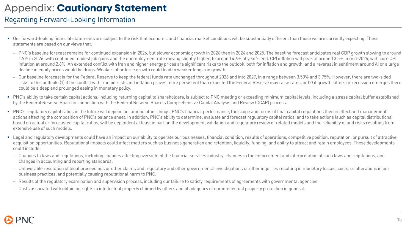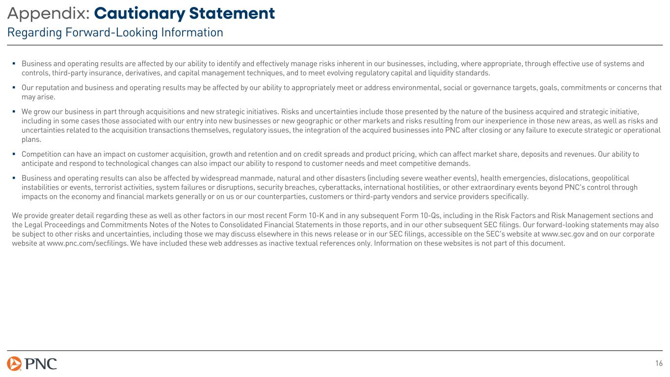 15 Appendix: Cautionary Statement Regarding Forward-Looking Information Our forward-looking financial statements are subject to the risk that economic and financial market conditions will be substantially different than those we are currently expecting. These statements are based on our views that: − PNC’s baseline forecast remains for continued expansion in 2026, but slower economic growth in 2026 than in 2024 and 2025. The baseline forecast anticipates real GDP growth slowing to around 1.9% in 2026, with continued modest job gains and the unemployment rate moving slightly higher, to around 4.6% at year’s end. CPI inflation will peak at around 3.5% in mid-2026, with core CPI inflation at around 2.6%. An extended conflict with Iran and higher energy prices are significant risks to the outlook, both for inflation and growth, and a reversal in sentiment around AI or a large decline in equity prices would be drags. Weaker labor force growth could lead to weaker long-run growth. − Our baseline forecast is for the Federal Reserve to keep the federal funds rate unchanged throughout 2026 and into 2027, in a range between 3.50% and 3.75%. However, there are two-sided risks to this outlook: (1) if the conflict with Iran persists and inflation proves more persistent than expected the Federal Reserve may raise rates, or (2) if growth falters or recession emerges there could be a deep and prolonged easing in monetary policy. PNC's ability to take certain capital actions, including returning capital to shareholders, is subject to PNC meeting or exceeding minimum capital levels, including a stress capital buffer established by the Federal Reserve Board in connection with the Federal Reserve Board's Comprehensive Capital Analysis and Review (CCAR) process. PNC's regulatory capital ratios in the future will depend on, among other things, PNC's financial performance, the scope and terms of final capital regulations then in effect and management actions affecting the composition of PNC's balance sheet. In addition, PNC's ability to determine, evaluate and forecast regulatory capital ratios, and to take actions (such as capital distributions) based on actual or forecasted capital ratios, will be dependent at least in part on the development, validation and regulatory review of related models and the reliability of and risks resulting from extensive use of such models. Legal and regulatory developments could have an impact on our ability to operate our businesses, financial condition, results of operations, competitive position, reputation, or pursuit of attractive acquisition opportunities. Reputational impacts could affect matters such as business generation and retention, liquidity, funding, and ability to attract and retain employees. These developments could include: − Changes to laws and regulations, including changes affecting oversight of the financial services industry, changes in the enforcement and interpretation of such laws and regulations, and changes in accounting and reporting standards. − Unfavorable resolution of legal proceedings or other claims and regulatory and other governmental investigations or other inquiries resulting in monetary losses, costs, or alterations in our business practices, and potentially causing reputational harm to PNC. − Results of the regulatory examination and supervision process, including our failure to satisfy requirements of agreements with governmental agencies. − Costs associated with obtaining rights in intellectual property claimed by others and of adequacy of our intellectual property protection in general.