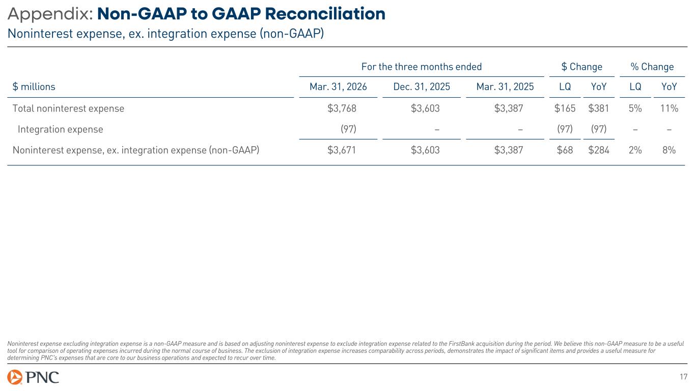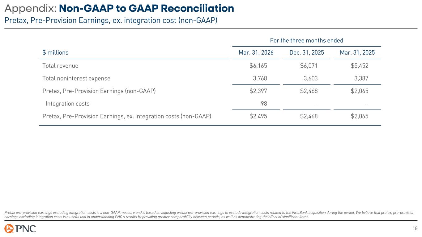 17 Appendix: Non-GAAP to GAAP Reconciliation Noninterest expense, ex. integration expense (non-GAAP) For the three months ended $ Change % Change $ millions Mar. 31, 2026 Dec. 31, 2025 Mar. 31, 2025 LQ YoY LQ YoY Total noninterest expense $3,768 $3,603 $3,387 $165 $381 5% 11% Integration expense (97) – – (97) (97) – – Noninterest expense, ex. integration expense (non-GAAP) $3,671 $3,603 $3,387 $68 $284 2% 8% Noninterest expense excluding integration expense is a non-GAAP measure and is based on adjusting noninterest expense to exclude integration expense related to the FirstBank acquisition during the period. We believe this non-GAAP measure to be a useful tool for comparison of operating expenses incurred during the normal course of business. The exclusion of integration expense increases comparability across periods, demonstrates the impact of significant items and provides a useful measure for determining PNC’s expenses that are core to our business operations and expected to recur over time.