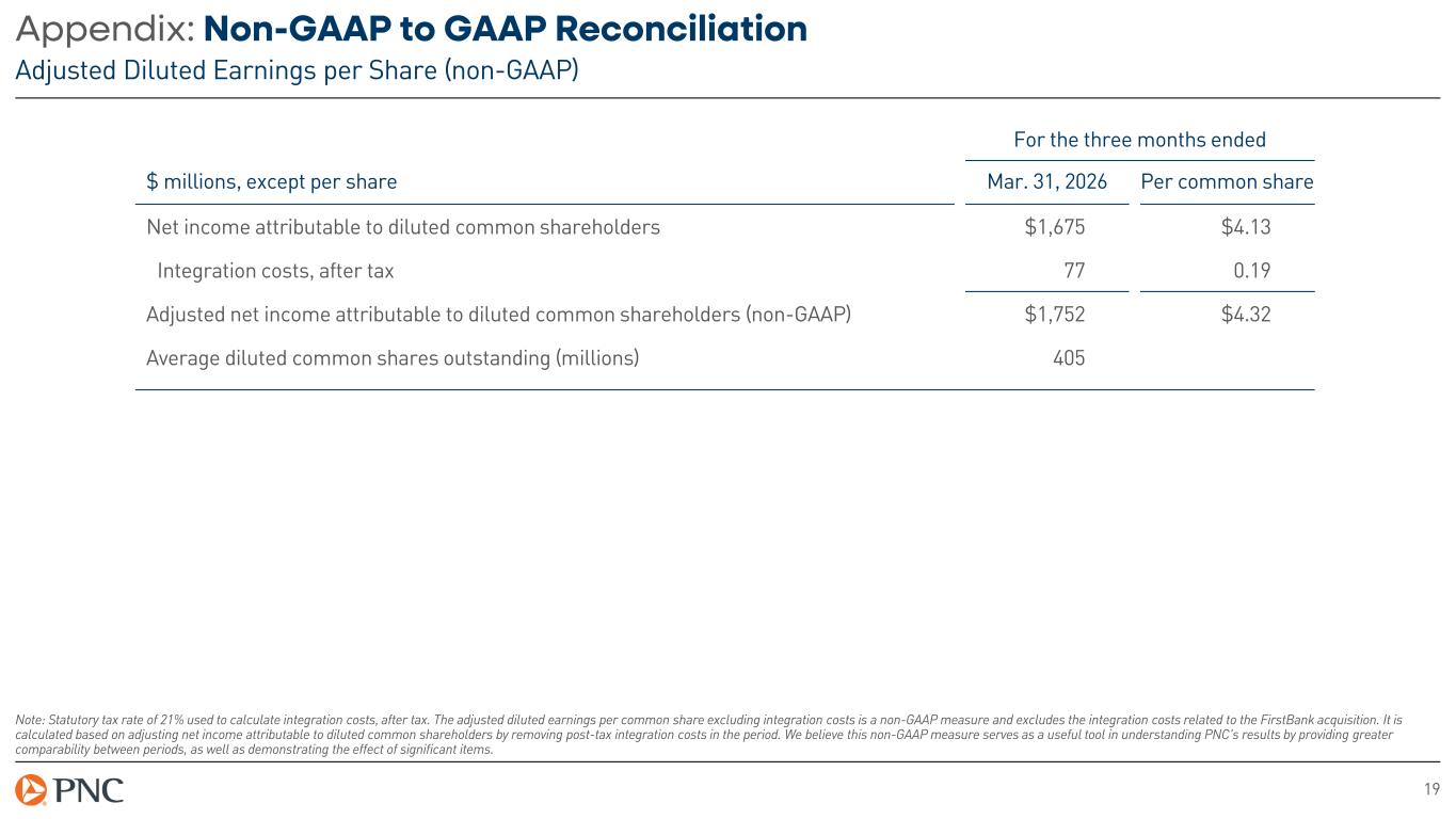 18 Appendix: Non-GAAP to GAAP Reconciliation Pretax, Pre-Provision Earnings, ex. integration cost (non-GAAP) For the three months ended $ millions Mar. 31, 2026 Dec. 31, 2025 Mar. 31, 2025 Total revenue $6,165 $6,071 $5,452 Total noninterest expense 3,768 3,603 3,387 Pretax, Pre-Provision Earnings (non-GAAP) $2,397 $2,468 $2,065 Integration costs 98 – – Pretax, Pre-Provision Earnings, ex. integration costs (non-GAAP) $2,495 $2,468 $2,065 Pretax pre-provision earnings excluding integration costs is a non-GAAP measure and is based on adjusting pretax pre-provision earnings to exclude integration costs related to the FirstBank acquisition during the period. We believe that pretax, pre-provision earnings excluding integration costs is a useful tool in understanding PNC's results by providing greater comparability between periods, as well as demonstrating the effect of significant items.
