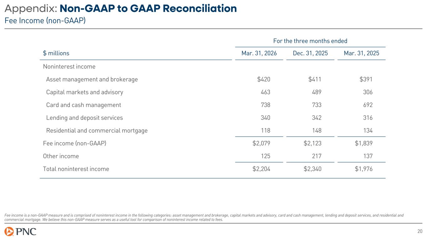 19 Appendix: Non-GAAP to GAAP Reconciliation Adjusted Diluted Earnings per Share (non-GAAP) For the three months ended $ millions, except per share Mar. 31, 2026 Per common share Net income attributable to diluted common shareholders $1,675 $4.13 Integration costs, after tax 77 0.19 Adjusted net income attributable to diluted common shareholders (non-GAAP) $1,752 $4.32 Average diluted common shares outstanding (millions) 405 Note: Statutory tax rate of 21% used to calculate integration costs, after tax. The adjusted diluted earnings per common share excluding integration costs is a non-GAAP measure and excludes the integration costs related to the FirstBank acquisition. It is calculated based on adjusting net income attributable to diluted common shareholders by removing post-tax integration costs in the period. We believe this non-GAAP measure serves as a useful tool in understanding PNC's results by providing greater comparability between periods, as well as demonstrating the effect of significant items.