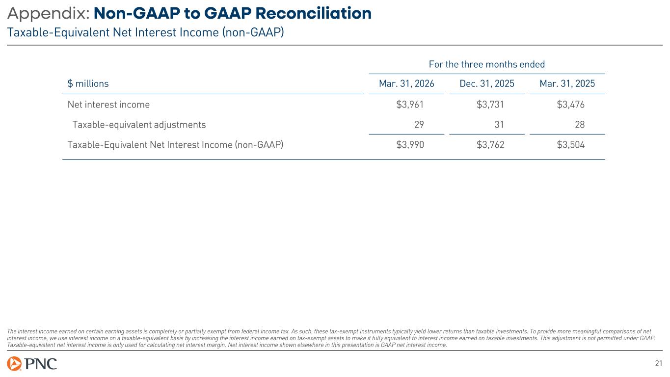 20 Appendix: Non-GAAP to GAAP Reconciliation Fee Income (non-GAAP) For the three months ended $ millions Mar. 31, 2026 Dec. 31, 2025 Mar. 31, 2025 Noninterest income Asset management and brokerage $420 $411 $391 Capital markets and advisory 463 489 306 Card and cash management 738 733 692 Lending and deposit services 340 342 316 Residential and commercial mortgage 118 148 134 Fee income (non-GAAP) $2,079 $2,123 $1,839 Other income 125 217 137 Total noninterest income $2,204 $2,340 $1,976 Fee income is a non-GAAP measure and is comprised of noninterest income in the following categories: asset management and brokerage, capital markets and advisory, card and cash management, lending and deposit services, and residential and commercial mortgage. We believe this non-GAAP measure serves as a useful tool for comparison of noninterest income related to fees.