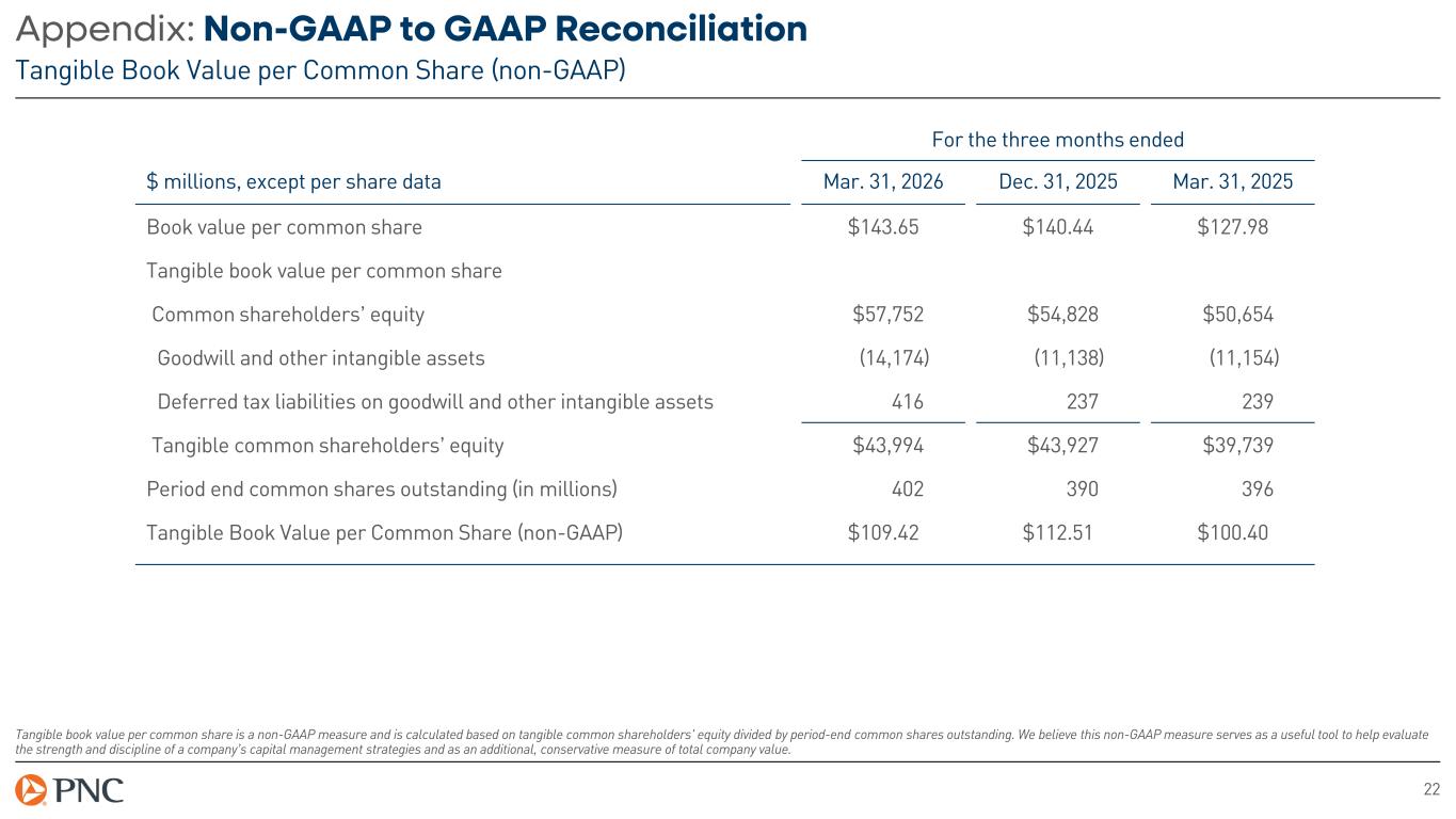 21 Appendix: Non-GAAP to GAAP Reconciliation Taxable-Equivalent Net Interest Income (non-GAAP) The interest income earned on certain earning assets is completely or partially exempt from federal income tax. As such, these tax-exempt instruments typically yield lower returns than taxable investments. To provide more meaningful comparisons of net interest income, we use interest income on a taxable-equivalent basis by increasing the interest income earned on tax-exempt assets to make it fully equivalent to interest income earned on taxable investments. This adjustment is not permitted under GAAP. Taxable-equivalent net interest income is only used for calculating net interest margin. Net interest income shown elsewhere in this presentation is GAAP net interest income. For the three months ended $ millions Mar. 31, 2026 Dec. 31, 2025 Mar. 31, 2025 Net interest income $3,961 $3,731 $3,476 Taxable-equivalent adjustments 29 31 28 Taxable-Equivalent Net Interest Income (non-GAAP) $3,990 $3,762 $3,504