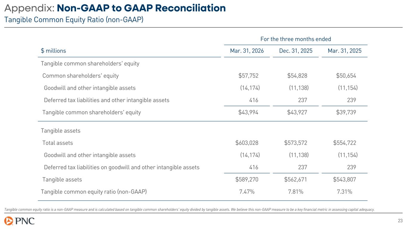 22 Appendix: Non-GAAP to GAAP Reconciliation Tangible Book Value per Common Share (non-GAAP) Tangible book value per common share is a non-GAAP measure and is calculated based on tangible common shareholders' equity divided by period-end common shares outstanding. We believe this non-GAAP measure serves as a useful tool to help evaluate the strength and discipline of a company’s capital management strategies and as an additional, conservative measure of total company value. For the three months ended $ millions, except per share data Mar. 31, 2026 Dec. 31, 2025 Mar. 31, 2025 Book value per common share $143.65 $140.44 $127.98 Tangible book value per common share Common shareholders’ equity $57,752 $54,828 $50,654 Goodwill and other intangible assets (14,174) (11,138) (11,154) Deferred tax liabilities on goodwill and other intangible assets 416 237 239 Tangible common shareholders’ equity $43,994 $43,927 $39,739 Period end common shares outstanding (in millions) 402 390 396 Tangible Book Value per Common Share (non-GAAP) $109.42 $112.51 $100.40