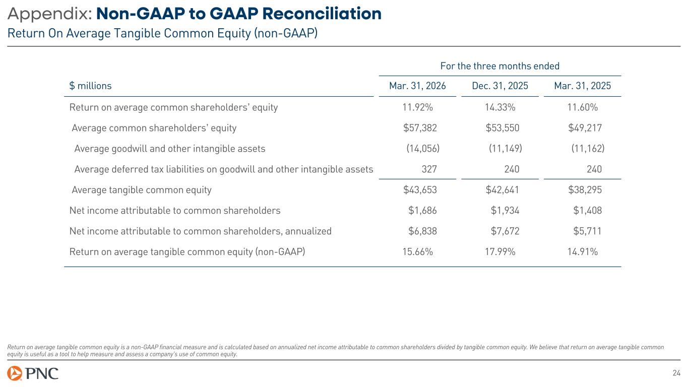23 Appendix: Non-GAAP to GAAP Reconciliation Tangible Common Equity Ratio (non-GAAP) Tangible common equity ratio is a non-GAAP measure and is calculated based on tangible common shareholders’ equity divided by tangible assets. We believe this non-GAAP measure to be a key financial metric in assessing capital adequacy. For the three months ended $ millions Mar. 31, 2026 Dec. 31, 2025 Mar. 31, 2025 Tangible common shareholders’ equity Common shareholders’ equity $57,752 $54,828 $50,654 Goodwill and other intangible assets (14,174) (11,138) (11,154) Deferred tax liabilities and other intangible assets 416 237 239 Tangible common shareholders’ equity $43,994 $43,927 $39,739 Tangible assets Total assets $603,028 $573,572 $554,722 Goodwill and other intangible assets (14,174) (11,138) (11,154) Deferred tax liabilities on goodwill and other intangible assets 416 237 239 Tangible assets $589,270 $562,671 $543,807 Tangible common equity ratio (non-GAAP) 7.47% 7.81% 7.31%
