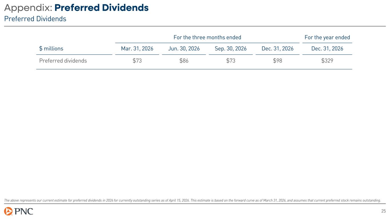 24 Appendix: Non-GAAP to GAAP Reconciliation Return On Average Tangible Common Equity (non-GAAP) Return on average tangible common equity is a non-GAAP financial measure and is calculated based on annualized net income attributable to common shareholders divided by tangible common equity. We believe that return on average tangible common equity is useful as a tool to help measure and assess a company's use of common equity. For the three months ended $ millions Mar. 31, 2026 Dec. 31, 2025 Mar. 31, 2025 Return on average common shareholders’ equity 11.92% 14.33% 11.60% Average common shareholders’ equity $57,382 $53,550 $49,217 Average goodwill and other intangible assets (14,056) (11,149) (11,162) Average deferred tax liabilities on goodwill and other intangible assets 327 240 240 Average tangible common equity $43,653 $42,641 $38,295 Net income attributable to common shareholders $1,686 $1,934 $1,408 Net income attributable to common shareholders, annualized $6,838 $7,672 $5,711 Return on average tangible common equity (non-GAAP) 15.66% 17.99% 14.91%
