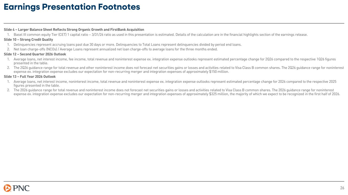 26 Earnings Presentation Footnotes Slide 4 – Larger Balance Sheet Reflects Strong Organic Growth and FirstBank Acquisition 1. Basel III common equity Tier (CET) 1 capital ratio – 3/31/26 ratio as used in this presentation is estimated. Details of the calculation are in the financial highlights section of the earnings release. Slide 10 – Strong Credit Quality 1. Delinquencies represent accruing loans past due 30 days or more. Delinquencies to Total Loans represent delinquencies divided by period end loans. 2. Net loan charge-offs (NCOs) / Average Loans represent annualized net loan charge-offs to average loans for the three months ended. Slide 12 – Second Quarter 2026 Outlook 1. Average loans, net interest income, fee income, total revenue and noninterest expense ex. integration expense outlooks represent estimated percentage change for 2Q26 compared to the respective 1Q26 figures presented in the table. 2. The 2Q26 guidance range for total revenue and other noninterest income does not forecast net securities gains or losses and activities related to Visa Class B common shares. The 2Q26 guidance range for noninterest expense ex. integration expense excludes our expectation for non-recurring merger and integration expenses of approximately $150 million. Slide 13 – Full Year 2026 Outlook 1. Average loans, net interest income, noninterest income, total revenue and noninterest expense ex. integration expense outlooks represent estimated percentage change for 2026 compared to the respective 2025 figures presented in the table. 2. The 2026 guidance range for total revenue and noninterest income does not forecast net securities gains or losses and activities related to Visa Class B common shares. The 2026 guidance range for noninterest expense ex. integration expense excludes our expectation for non-recurring merger and integration expenses of approximately $325 million, the majority of which we expect to be recognized in the first half of 2026.