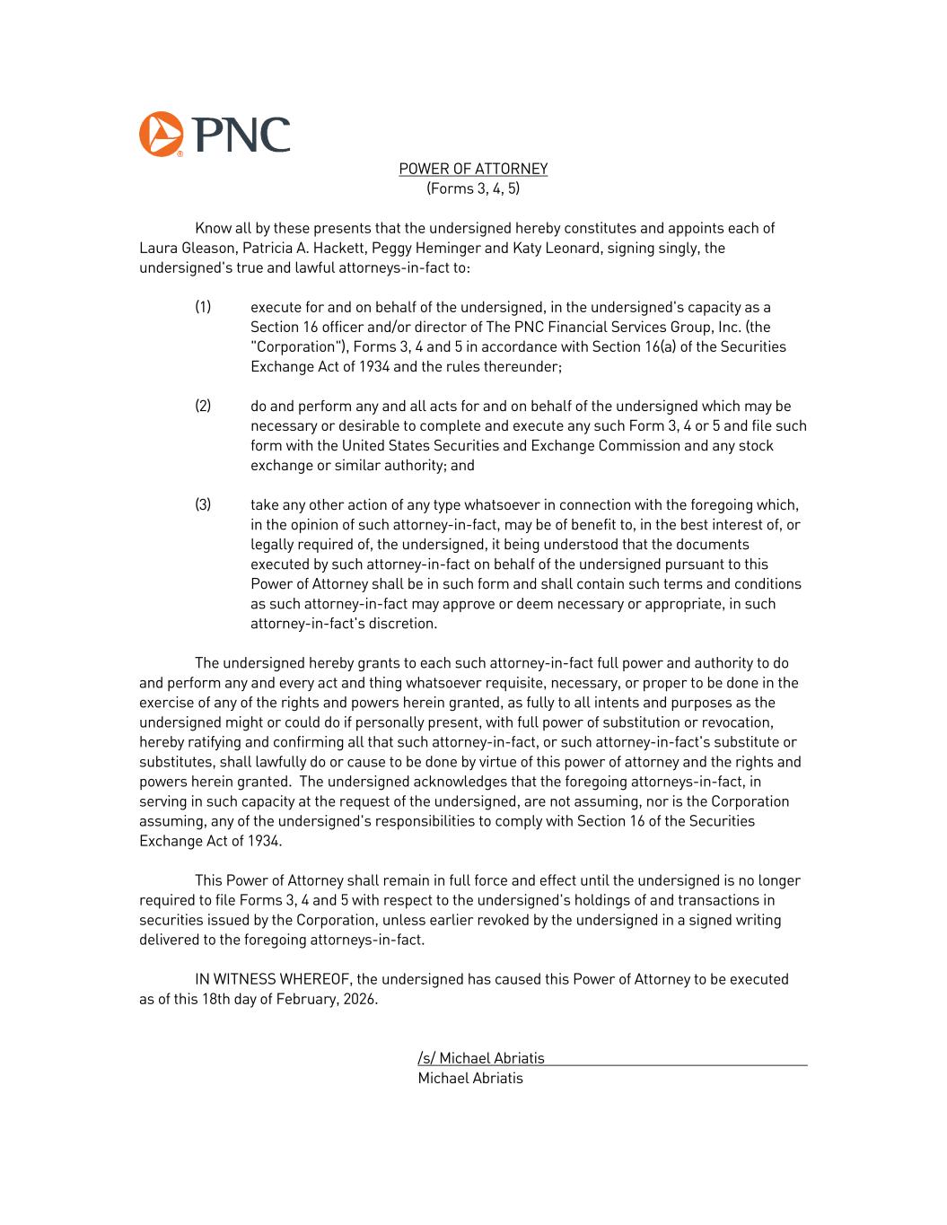 POWER OF ATTORNEY (Forms 3, 4, 5) Know all by these presents that the undersigned hereby constitutes and appoints each of Laura Gleason, Patricia A. Hackett, Peggy Heminger and Katy Leonard, signing singly, the undersigned's true and lawful attorneys-in-fact to: (1) execute for and on behalf of the undersigned, in the undersigned's capacity as a Section 16 officer and/or director of The PNC Financial Services Group, Inc. (the "Corporation"), Forms 3, 4 and 5 in accordance with Section 16(a) of the Securities Exchange Act of 1934 and the rules thereunder; (2) do and perform any and all acts for and on behalf of the undersigned which may be necessary or desirable to complete and execute any such Form 3, 4 or 5 and file such form with the United States Securities and Exchange Commission and any stock exchange or similar authority; and (3) take any other action of any type whatsoever in connection with the foregoing which, in the opinion of such attorney-in-fact, may be of benefit to, in the best interest of, or legally required of, the undersigned, it being understood that the documents executed by such attorney-in-fact on behalf of the undersigned pursuant to this Power of Attorney shall be in such form and shall contain such terms and conditions as such attorney-in-fact may approve or deem necessary or appropriate, in such attorney-in-fact's discretion. The undersigned hereby grants to each such attorney-in-fact full power and authority to do and perform any and every act and thing whatsoever requisite, necessary, or proper to be done in the exercise of any of the rights and powers herein granted, as fully to all intents and purposes as the undersigned might or could do if personally present, with full power of substitution or revocation, hereby ratifying and confirming all that such attorney-in-fact, or such attorney-in-fact's substitute or substitutes, shall lawfully do or cause to be done by virtue of this power of attorney and the rights and powers herein granted. The undersigned acknowledges that the foregoing attorneys-in-fact, in serving in such capacity at the request of the undersigned, are not assuming, nor is the Corporation assuming, any of the undersigned's responsibilities to comply with Section 16 of the Securities Exchange Act of 1934. This Power of Attorney shall remain in full force and effect until the undersigned is no longer required to file Forms 3, 4 and 5 with respect to the undersigned's holdings of and transactions in securities issued by the Corporation, unless earlier revoked by the undersigned in a signed writing delivered to the foregoing attorneys-in-fact. IN WITNESS WHEREOF, the undersigned has caused this Power of Attorney to be executed as of this 18th day of February, 2026. /s/ Michael Abriatis Michael Abriatis